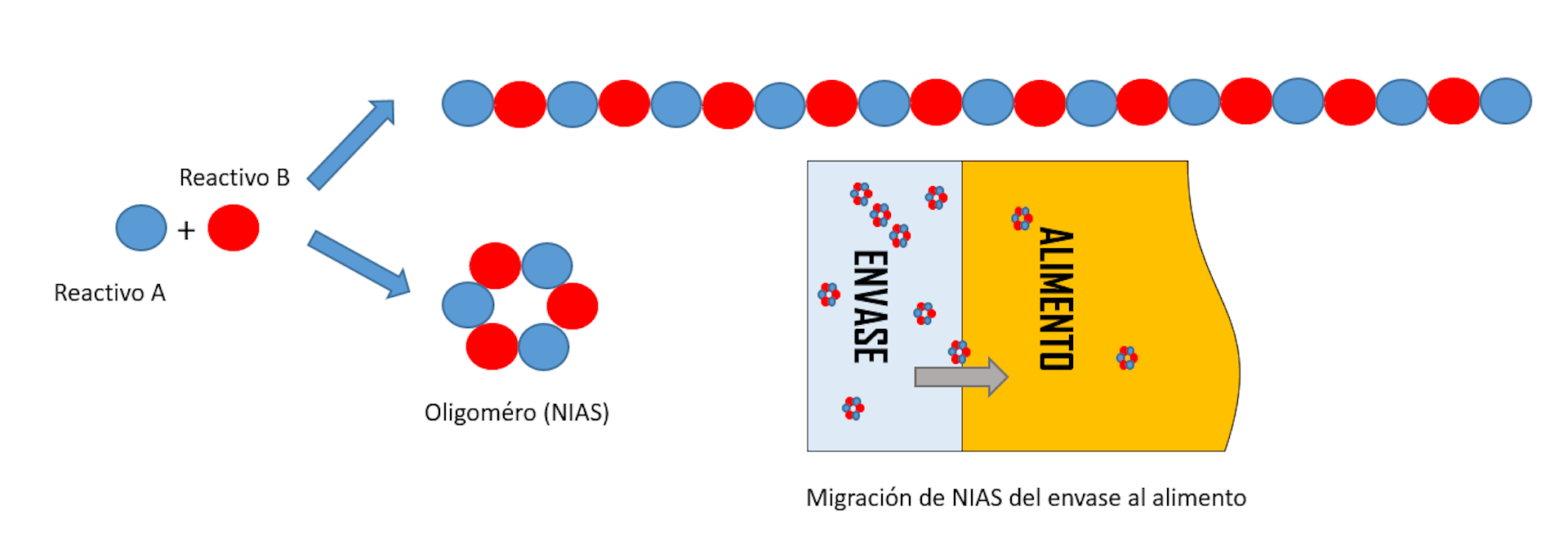Subproductos. Se forman como resultado de la producción del envase. Un ejemplo claro son los oligómeros, generados como consecuencia de la polimerización. Mediante este proceso, dos grupos químicos reaccionan y se unen para formar cadenas de unidades repetitivas. Podría asemejarse a la introducción de abalorios en un cordel muy largo. Pero al producirse estas reacciones también se forman otros productos más pequeños, los citados oligómeros, que son cadenas incompletas. Siguiendo con el símil anterior, recordarían a pulseras de abalorios.